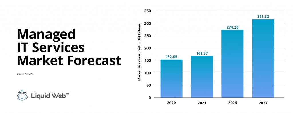 It’s no surprise then that Statista predicts the global managed IT services market will grow from $161.37 billion in 2021 to more than $300 billion by 2027.